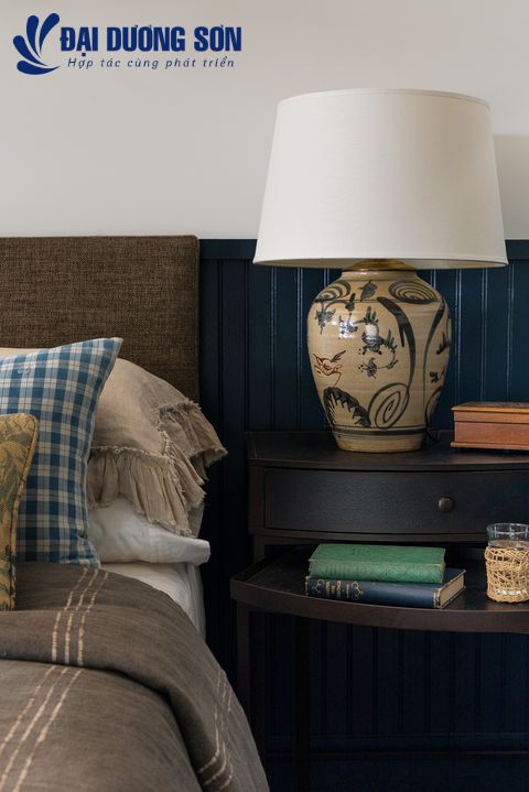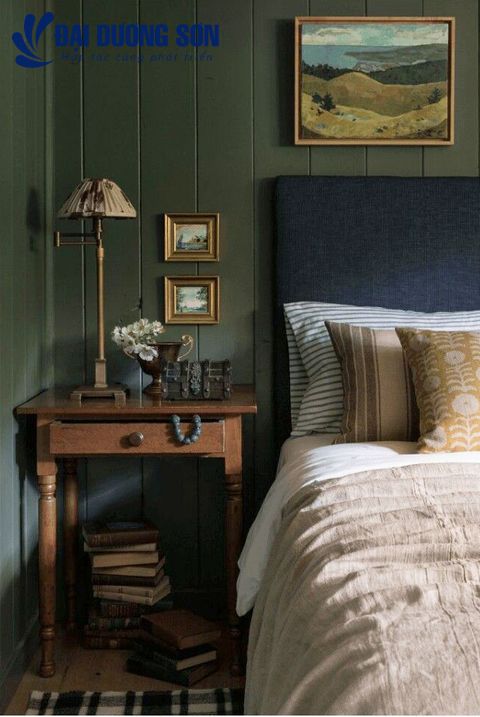 Heidi Caillier đã chọn gam màu xanh đậm của hải quân để kết hợp với các tông màu xanh lá cây, nâu và xanh dương trong phòng ngủ này. Để ngăn không cho nó bị nuốt chửng trong bóng tối, cô chỉ sơn tường tông màu này cho đến dòng ghế. Sự tương phản này cũng thêm vào một yếu tố khác của âm mưu.