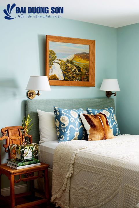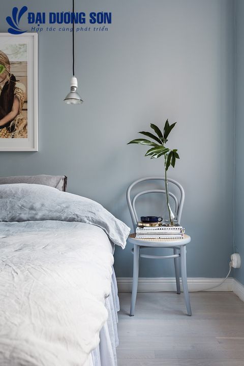 Màu xanh dịu nhẹ tạo cảm giác như được hít thở không khí trong lành khi bạn bước vào phòng. Nó tăng thêm chất thanh tao, mơ mộng cho mọi không gian nhưng cũng mang lại rất nhiều tính linh hoạt, làm cho nó đặc biệt phù hợp cho phòng ngủ. Bộ khăn trải giường bằng vải lanh và chiếc ghế làm điểm nhấn bên bàn tạm góp phần tạo nên sự sang trọng dễ dàng mà không bị phai mờ.