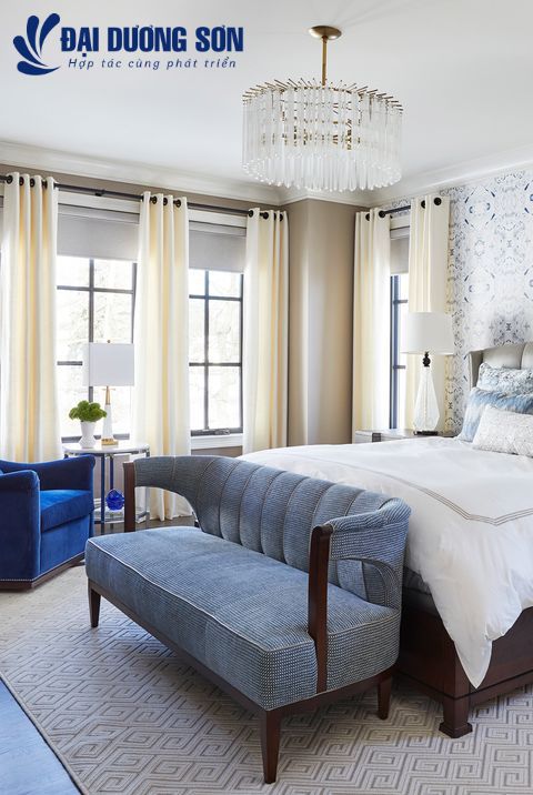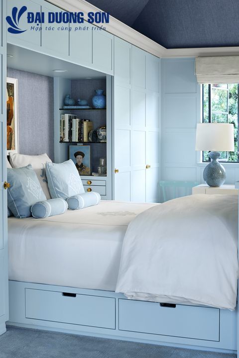 Sơn bóng cao cấp là một cách chắc chắn để tạo ra một tuyên bố táo bạo. Trong phòng ngủ này được thiết kế bởi nhà trang trí Alisa Bloom, ánh sáng lỏng, đậm đà của lớp sơn phủ phản chiếu ánh sáng xung quanh một căn phòng tối. Cô đã sử dụng Fine P Paint of Europe’s Delft Blue 4003 in Hollandlac Brilliant để chiếu sáng toàn bộ phòng ngủ.