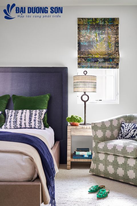 Sơn tường của bạn một màu xanh nước biển đậm đẹp mắt và sau đó nhấn mạnh chiều sâu bằng các điểm nhấn màu trắng sắc nét và bộ đồ giường rực rỡ cho một phòng ngủ cân đối. Trong không gian do Mally Skok thiết kế này, các họa tiết vui tươi tương phản độc đáo với những bức tường màu xanh lam đậm, tạo cho căn phòng một cảm giác nhẹ nhàng.