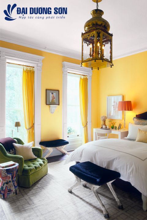 Phòng ngủ này chứng minh rằng cúc vạn thọ có thể trông đẹp như thế nào với màu xanh nước biển và xanh ô liu. Bóng nắng này cũng hoạt động độc đáo khi bạn kết hợp các mảng nhấn với lớp hoàn thiện bằng kim loại để tạo ra một thẩm mỹ quyến rũ. Hãy nghĩ đến đèn và ghế đẩu bằng đồng với khung hình thú vị. Những kết thúc này làm nổi bật tính cách tỏa sáng của màu vàng.