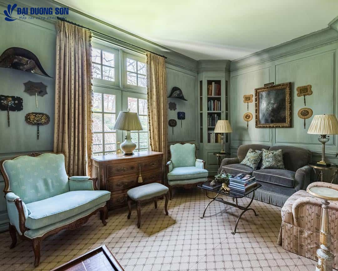 Màu sắc của phòng khách cũng được chọn theo diện tích mặt sàn và chiều cao của trần. Để phòng khách trông có vẻ rộng hơn, người ta thường sơn trần nhạt màu hơn so với 4 bức tường xung quanh. Tương tự như vậy, nếu phòng khách nhà bạn rộng rãi, thoáng đãng hơn, thì bạn có thể sơn màu tường đậm hơn màu sàn.