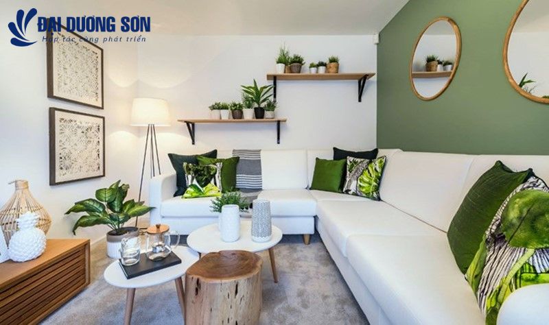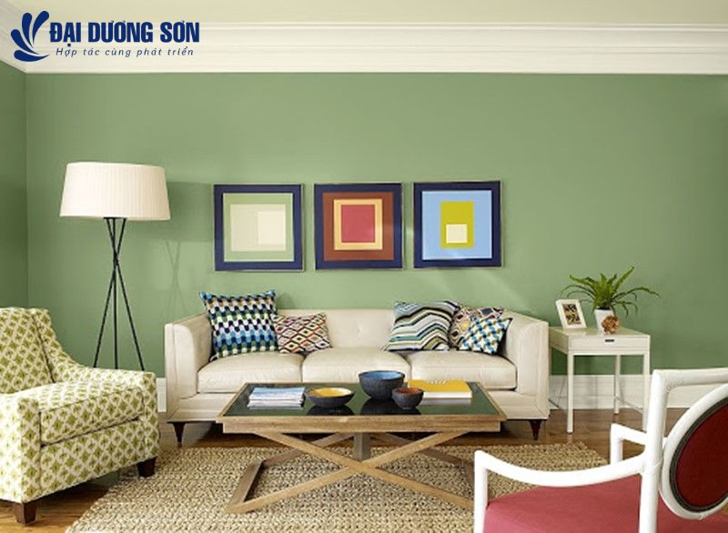 Phối màu sơn phòng khách xanh lá phong thủy đẹp - hiện đại - gần gũi