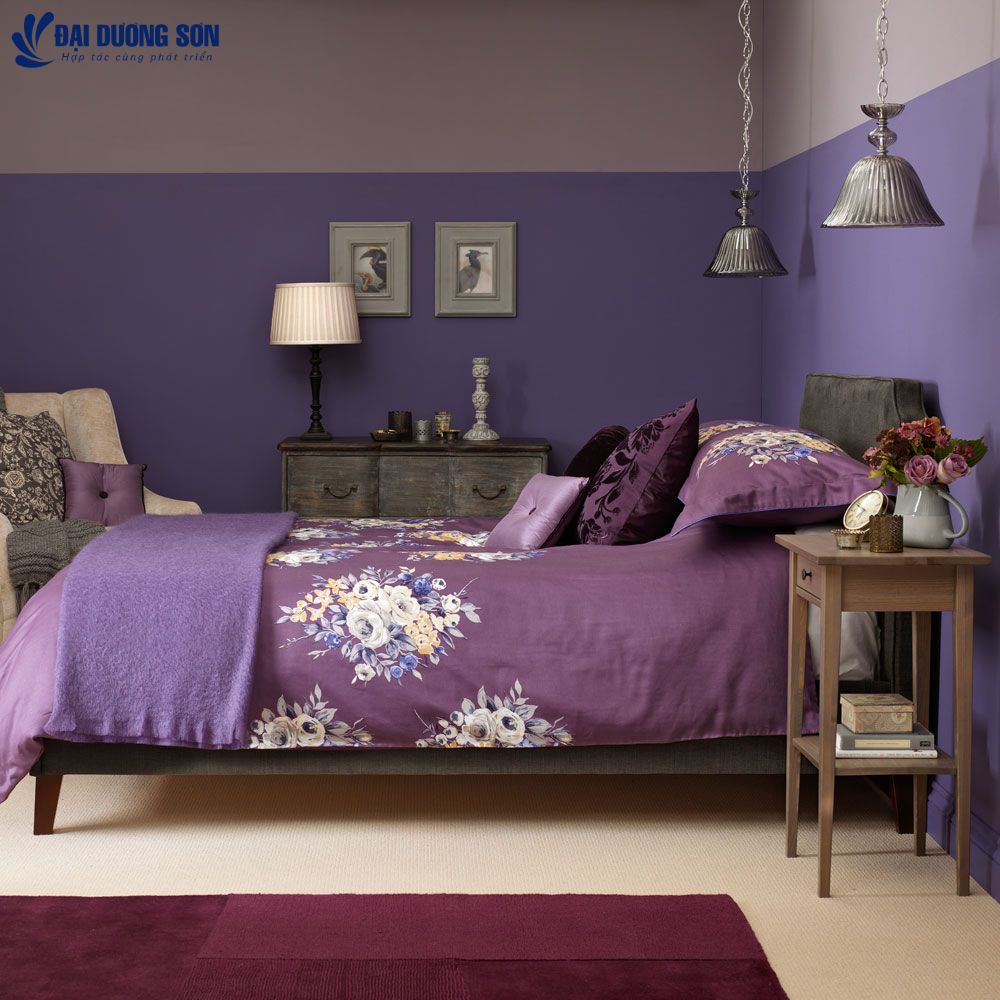 Sau ý tưởng phòng ngủ màu tím? Đây không phải là Màu của năm 2018 của Pantone không có lý do! Ấm cúng với sắc xám trầm của cây thạch nam và xám. Những sắc thái nhẹ nhàng như thế này là hoàn hảo nếu bạn muốn có một không gian cảm thấy ấm áp và thư giãn. Hãy để một bức tranh in hoa phong cách cổ điển là điểm khởi đầu cho cách phối màu của bạn. Màu nền tím của chăn lông vũ là tông màu mạnh nhất được sử dụng trong phòng - đừng lạm dụng nó nếu không hiệu ứng sẽ quá sặc sỡ.