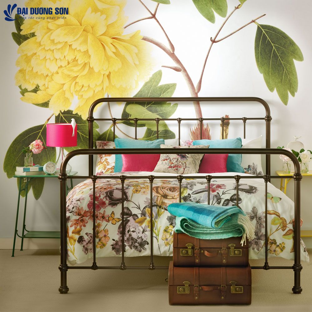 Bức tranh tường thực vật tươi sáng và đậm nét rõ ràng là trọng tâm chính của căn phòng ngủ khá sặc sỡ này, nhưng đó là những phụ kiện bắt mắt có thể chuyển từ rực rỡ đến tuyệt vời nhanh hơn bạn có thể nói "làm ơn bật đèn đi"! Bệ trải giường bằng kim loại màu đen tạo thêm nét nam tính là sự cân bằng hoàn hảo cho tất cả những bông hoa.
