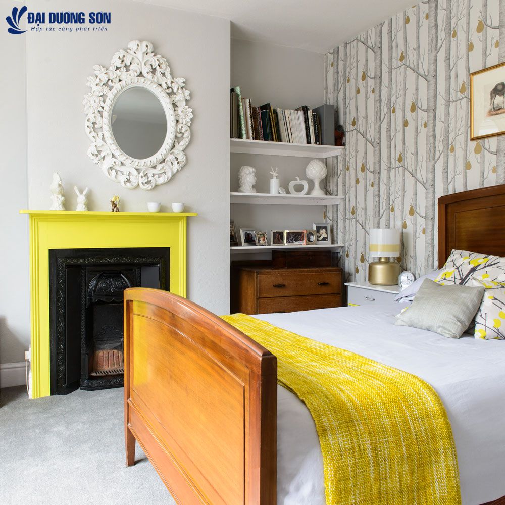 Hãy để những tông màu vui tươi của màu vàng thực sự nổi tiếng, khi được sử dụng làm màu nhấn cho màu xám tắt. để tiến xa hơn một bước về cách phối màu ngoài các phụ kiện và bộ đồ giường, hãy thử sơn một bức tường nổi bật hoặc xung quanh lửa.