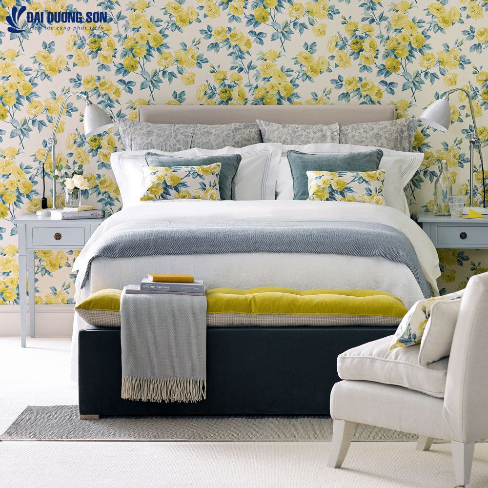Bạn thích một cái nhìn mới mẻ trong phòng ngủ cho mùa xuân? Vậy tại sao không nói điều đó với hoa? Hình nền hoa màu vàng zesty là ngôi sao của chương trình trong phòng ngủ này. Kết hợp nó với các sắc thái sang trọng của màu xám, làm tông màu toàn bộ sơ đồ xuống và tránh cho giấy bị quá tải. Giữ các mẫu khác ở mức tối thiểu và có quy mô nhỏ thay vì lớn, chẳng hạn như vỏ gối bằng vải gấm hoa màu xám và ném cá trích. Cân bằng các bức tường đậm với đồ nội thất đơn giản, sắp xếp hợp lý, như đầu giường được thiết kế riêng, bàn bên trơn và ghế đẩu bọc nệm.