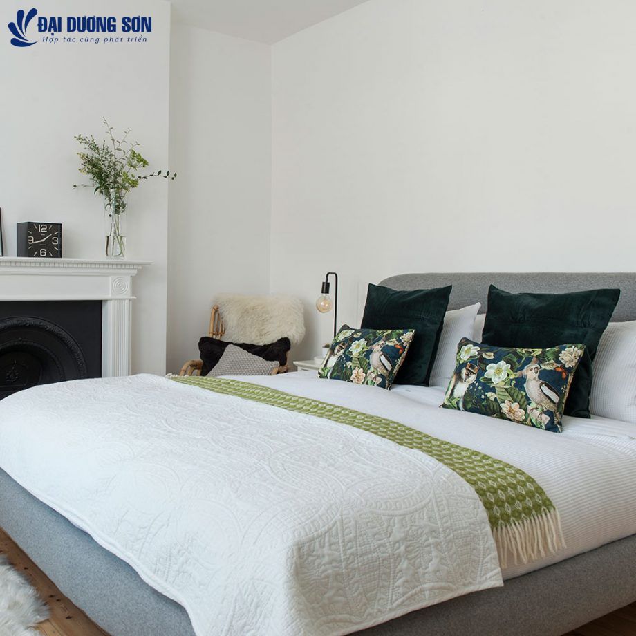Màu trắng là một màu cổ điển, êm dịu cho phòng ngủ. Nhưng đơn giản không có nghĩa là nhàm chán. Để giữ cho phòng ngủ cảm giác yên bình với những bức tường trắng và sàn gỗ tự nhiên, những đồ trang trí bằng tông màu xanh lá cây và các họa tiết đẹp mắt sẽ thu hút sự quan tâm. Lớp nền trung tính cũng có nghĩa là bạn có thể kết hợp mọi thứ với các loại vải dệt và khăn trải giường khác nhau, tùy theo mùa. Phần đế trung tính toàn màu trắng cho phép bạn thay đổi màu nhấn khi sở thích của bạn có thể thay đổi.
