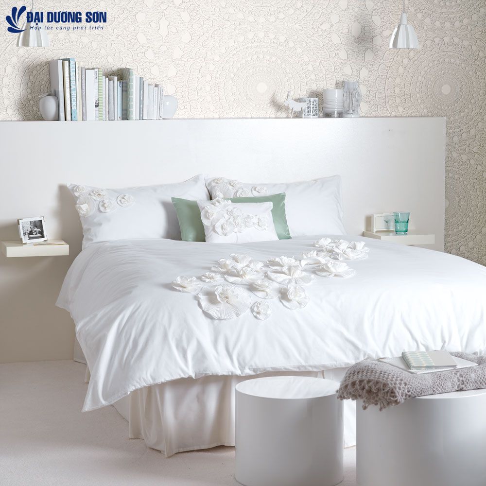 Đơn giản nhưng vô cùng tinh tế, một sơ đồ phòng ngủ toàn màu trắng như thế này chỉ tỏa ra sự quyến rũ. Đặt giấy dán tường có hoa văn ren quá khổ làm điểm khởi đầu cho căn phòng. Với một tờ giấy vừa đủ, bạn có thể tô đậm hoa văn - càng lớn càng tốt. Thêm một tấm ván đầu giường siêu lớn làm từ gỗ MDF sơn trắng bóng cho độ sáng bóng tối đa. Gắn các kệ nổi làm bàn đầu giường và thêm các mặt dây treo thấp để giảm thiểu sự lộn xộn. Bộ khăn trải giường toàn màu trắng là thứ bắt buộc cho diện mạo này - chỉ cần phủ lớp vỏ gối, đệm và các chi tiết ren hoặc móc. Các kết cấu khác nhau là chìa khóa để làm cho sơ đồ ba chiều thay vì phẳng.