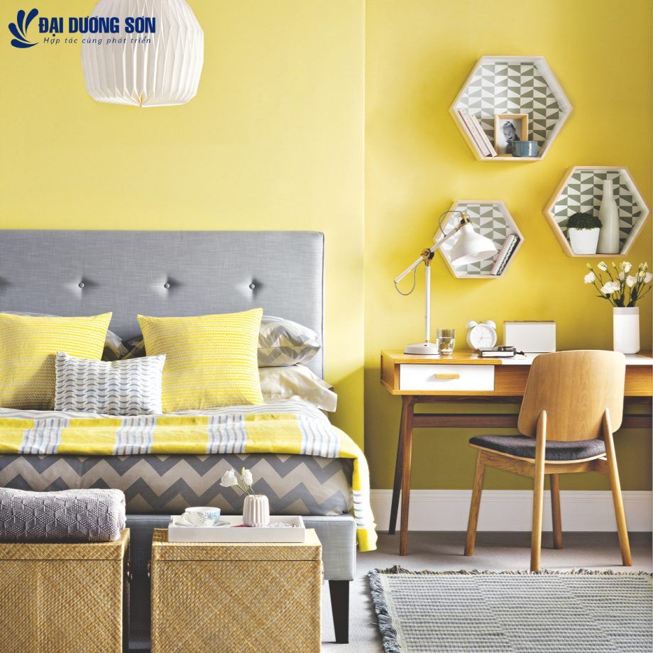 Đánh thức các giác quan. Sơn phòng ngủ của bạn bằng màu vàng nếu bạn muốn một không gian tràn ngập ánh nắng và những rung cảm tích cực. Mang đến cho bất kỳ phòng ngủ nào cảm giác tươi sáng, dễ chịu với hoa anh thảo giúp nâng cao tâm trạng. Lý tưởng nhất, nó sẽ nhắc nhở bạn về những ngày nắng. Màu vàng và màu xám là một sự kết hợp tuyệt vời và kết hợp rất ăn ý với nhau.