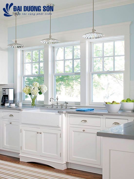 Nhà bếp màu trắng cổ điển với một chút màu xanh lam. Thêm lấp lánh với màu bạc và giảm bớt ánh sáng trắng cường độ cao với các bức tường màu xanh dương nhạt.
