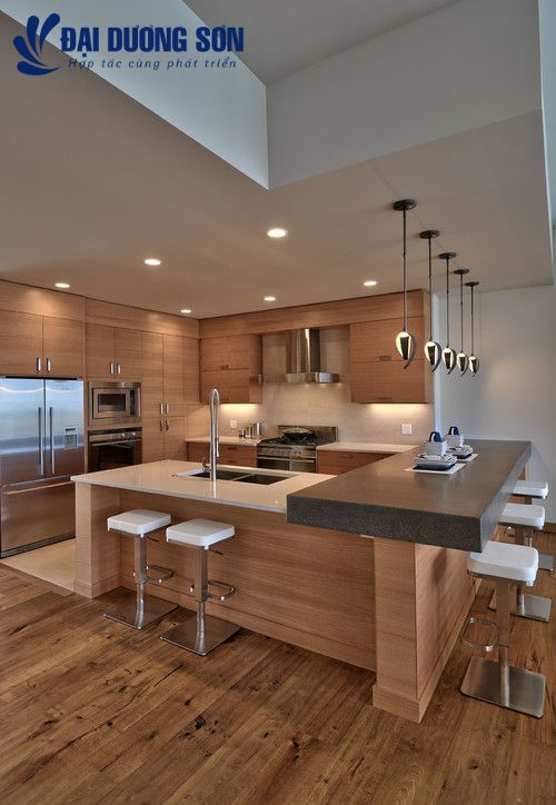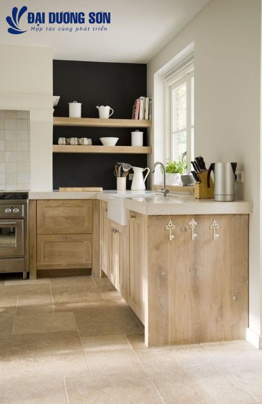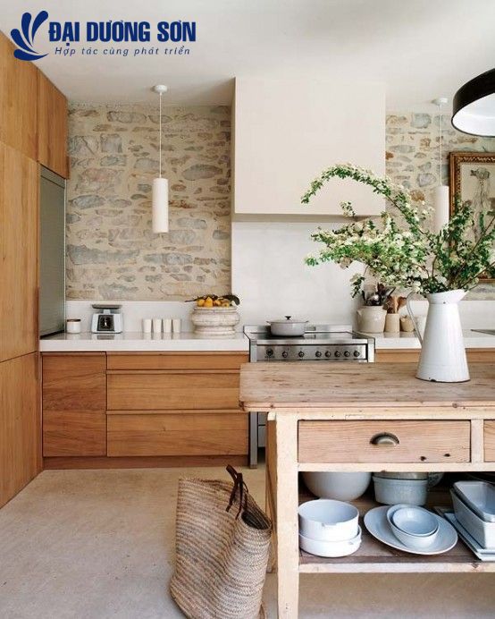 Không ai bận tâm với sơn? Bạn có thể dựa vào những đường vân gỗ đẹp và tự nhiên để tạo cho căn bếp của mình một phong cách tuyệt vời. Cân bằng các mô hình bận rộn với các thiết bị bằng đá và thép tự nhiên.