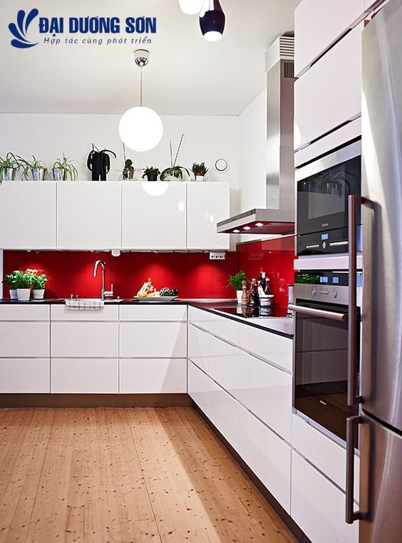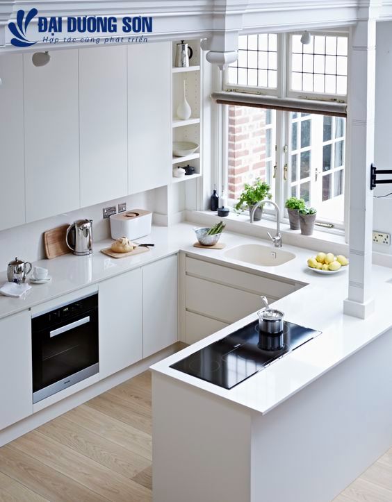 Nhà bếp màu trắng đã trở thành mốt trong một thời gian dài và nó vẫn tồn tại ở đây. Sạch sẽ, hiện đại và hợp lý.