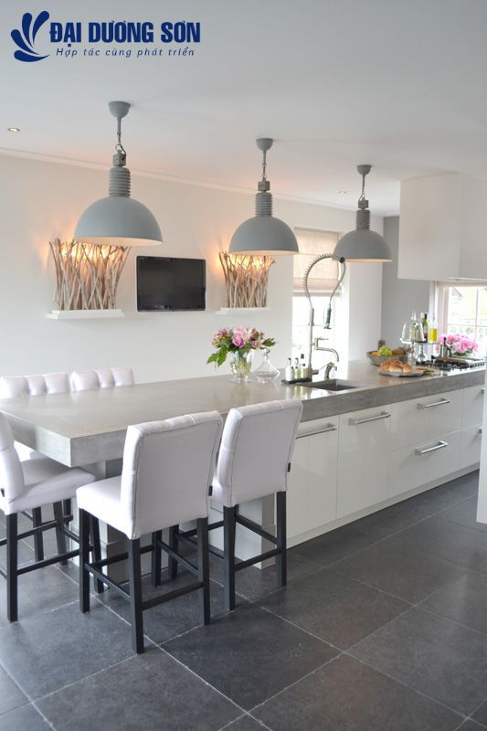 Sạch sẽ, ý nghĩa và vượt thời gian. Bảng màu trắng và xám cơ bản cũng cung cấp khả năng vô tận để làm nổi bật các bổ sung đầy màu sắc - một bát trái cây, một bó hoa đầy màu sắc, rau xanh hoặc bộ đồ ăn sáng màu.