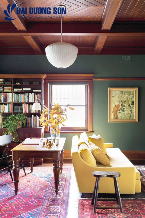 Màu sơn xanh quân đội moody bổ sung cho các chi tiết bằng gỗ gụ khắp căn phòng trong khi chiếc ghế sofa màu vàng nắng và thảm trải nhiều lớp màu hồng làm bừng sáng không gian.