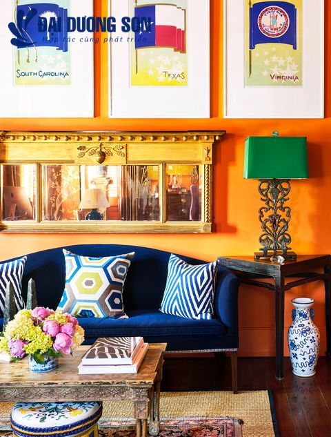 Những bức tường màu cam trong phòng này của Matthew Bees cung cấp một phông nền năng động cho các tác phẩm nghệ thuật và chụp đèn màu xanh lục bảo. Thật bất ngờ, nhưng làm cho căn phòng có cảm giác nắng.