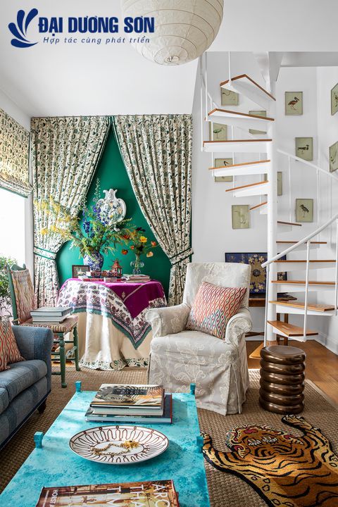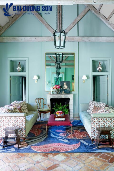 Màu sắc tươi mới này tạo cảm giác căn phòng giống như một ốc đảo nhiệt đới. Trong căn phòng này của Thomas Jayne và William Cullum, nơi sơn trải dài đến tận xà nhà cao trong phòng khách này, màu sắc thay đổi tùy thuộc vào cách ánh sáng chiếu vào nó, chuyển đổi giữa màu xanh bạc hà sắc nét và màu xanh lá cây bọt biển mềm mại.