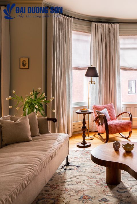 Nhà thiết kế Jae Joo đã chọn một bảng màu nhẹ nhàng trong phòng khách ở Boston năm 1885 này. Chiếc ghế bành màu hồng nhạt tạo thêm độ nổi trẻ trung cho các mảng gỗ tối màu đồng thời mang lại tông màu ấm hơn trong phông nền trung tính linh hoạt. Trong một số ánh sáng, nó có màu xanh xám nhạt và ở một số ánh sáng khác, nó có màu be hơn.
