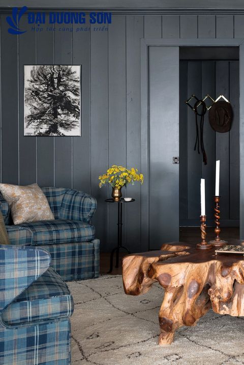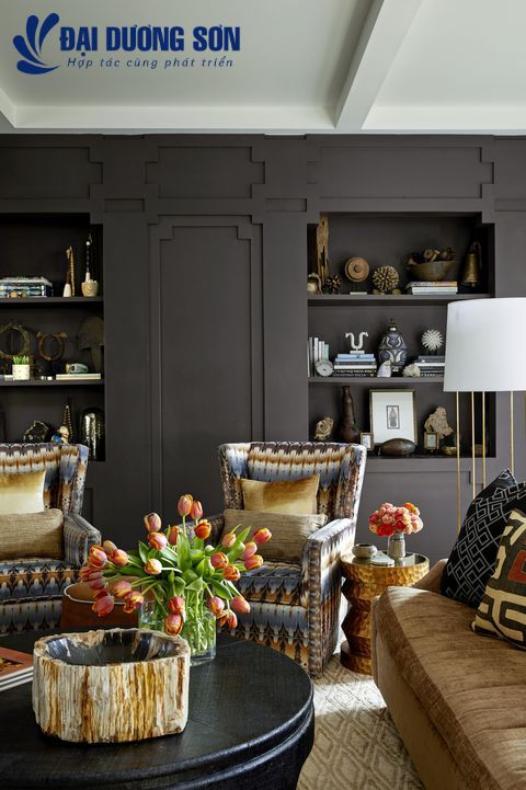 Nhà thiết kế Kristin Kong đã giấu một cánh cửa dẫn đến tầng hầm đằng sau xưởng chế tác sơn màu Black Fox của Sherwin-Williams trong nhà của cô gần Atlanta. Cô ấy nói mẹo "làm cho căn phòng trông bớt ngột ngạt hơn", vì màu tối giúp mọi thứ hòa hợp với nhau. Và đừng bao giờ đánh giá thấp sức mạnh của một cắm hoa đẹp trên bàn cà phê!