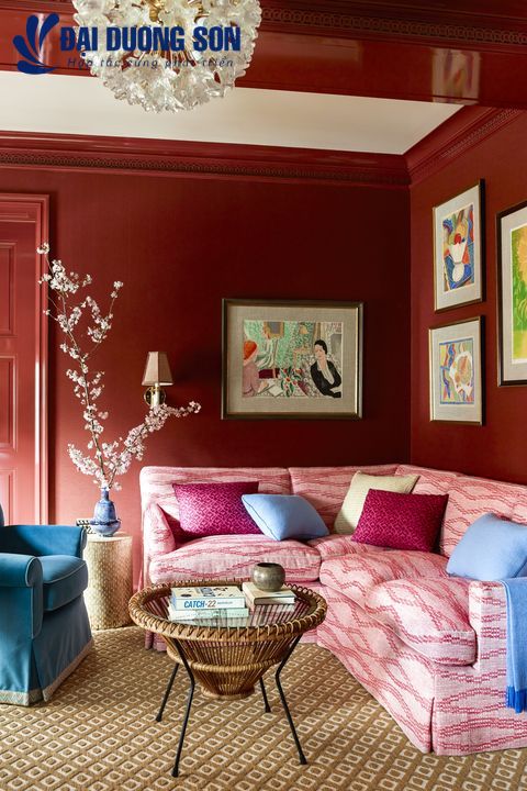 Những màu đỏ rực rỡ và ngôi nhà của bạn sẽ không giống như một hỏa tiễn. Màu đỏ đậm hơn màu này không gian của Katie Ridder, khi đồ nội thất tương phản với màu hồng và lam giúp phá vỡ màu đậm.