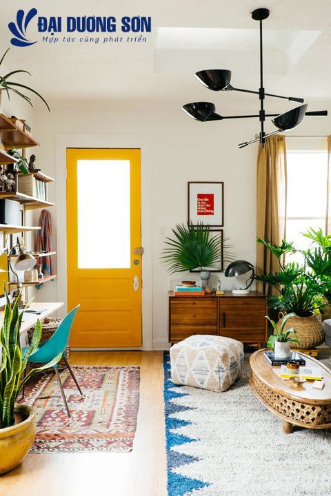 Ý nghĩ sơn phòng khách màu vàng có làm bạn sợ hãi đến tận cùng không? Thay vào đó, chỉ cần sơn một điểm nhấn, chẳng hạn như một cánh cửa hoặc một bức tường.