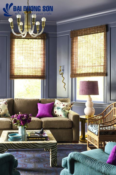 Cả tường và trần của căn phòng này của Angie Hranowsky đều được sơn màu thạch anh tím. Những mảng màu tím sáng hơn trên ghế sofa và đèn Christopher Spitzmiller tạo cho nó một chút tương phản, vì vậy nó không có cảm giác quá tắt tiếng.